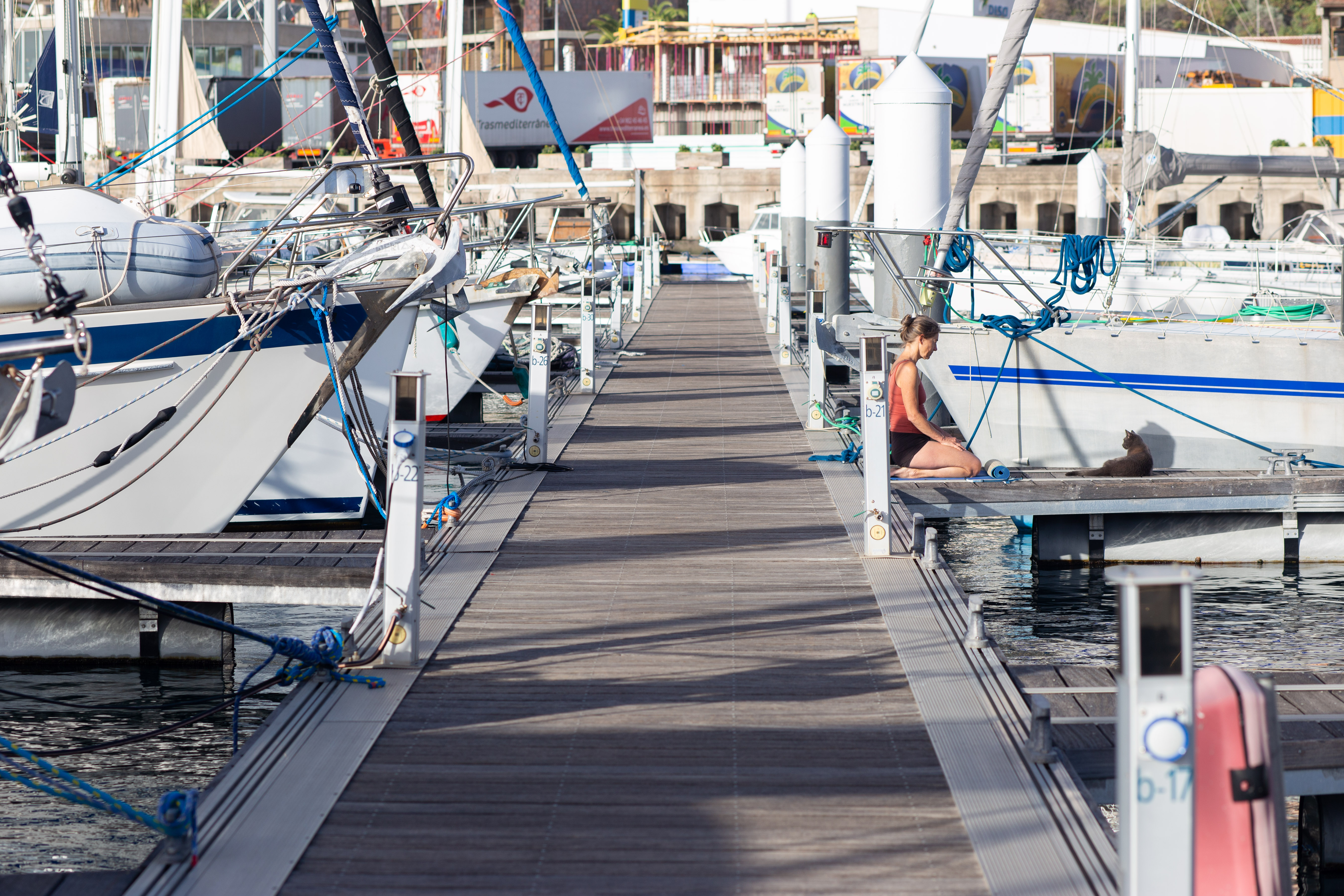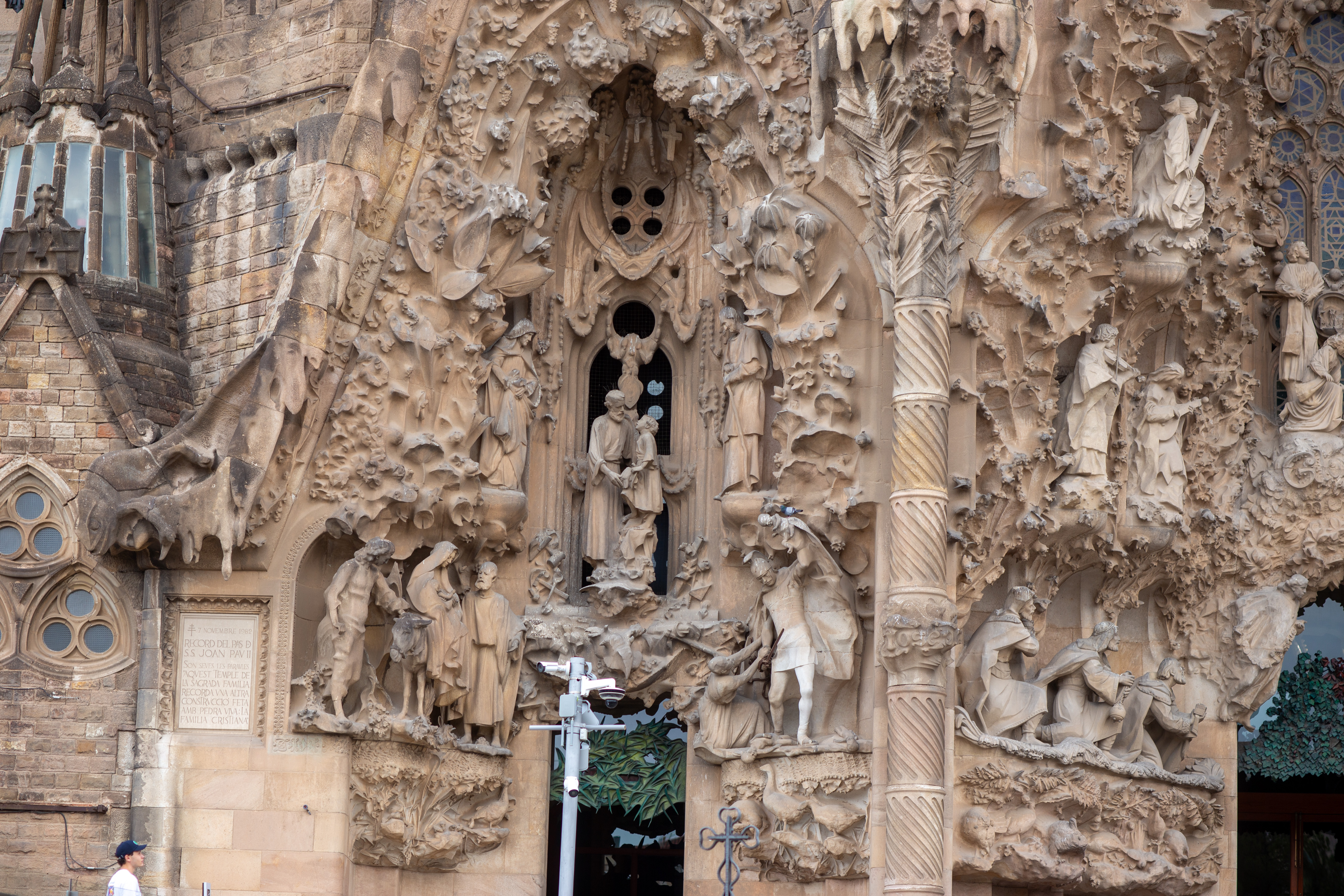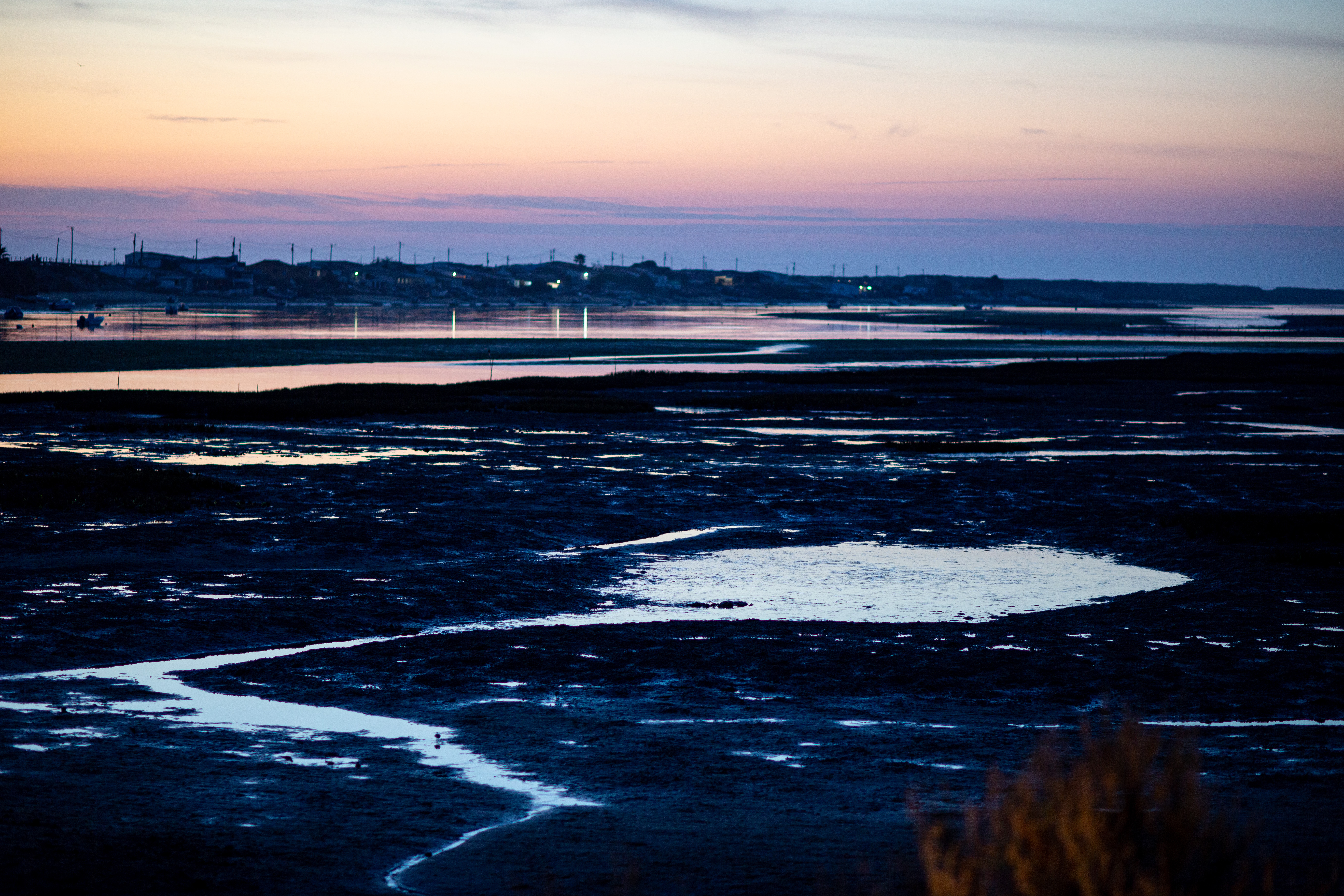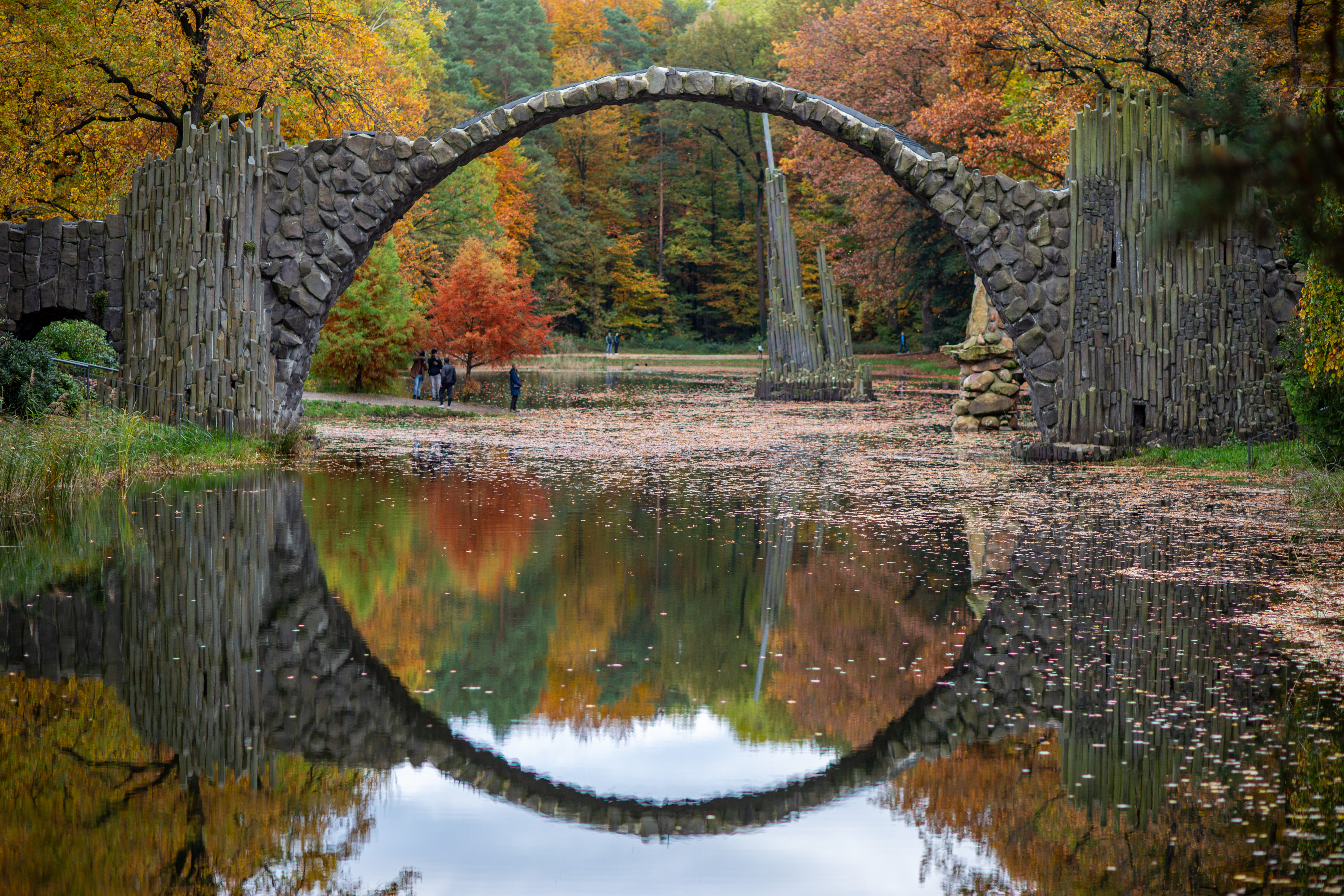 The image features a striking view of two rock formations in a desert landscape. The left rock formation, a large, dark brown rock, stands tall with a narrow crack running through it. The right rock formation, a smaller, reddish-brown rock, is more prominent and has a larger crack. Both formations are surrounded by sparse vegetation, creating a stark contrast between the ruggedness of the rock formations and the softness of the vegetation. The sky above is a clear blue, adding to the overall tranquility of the scene. The image does not contain any discernible text or human-made objects. The relative positions of the rock formations and vegetation suggest a vast, open space, with the rock formations as the main focus and the vegetation as a secondary element. The image does not provide any information about the exact location or history of the rock formations.