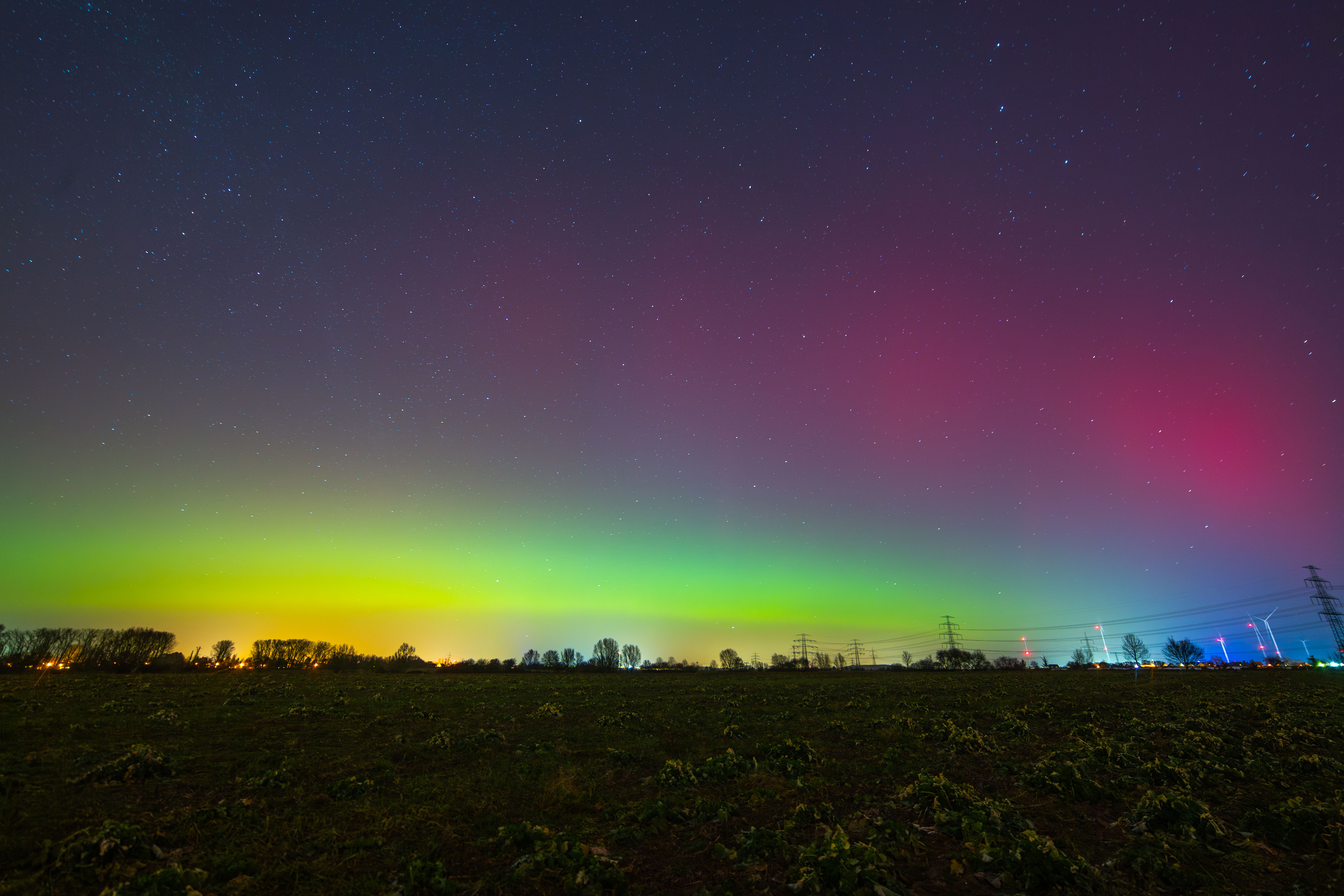 The image captures the breathtaking view of the aurora borealis, a vibrant display of colors against a dark sky. The aurora, a large, colorful cloud, stretches across the sky, its hues of red, orange, yellow, green, blue, and purple creating a mesmerizing spectacle. The sky is a deep blue, dotted with stars that add depth and dimension to the scene. In the foreground, a field of green plants stretches out, providing a stark contrast to the colorful aurora. Power lines crisscross the sky, adding a touch of modernity to the natural landscape. The image is taken from a low angle, emphasizing the grandeur of the aurora and the vastness of the sky. The identifier "sa_1500" does not provide additional information about the landmark.